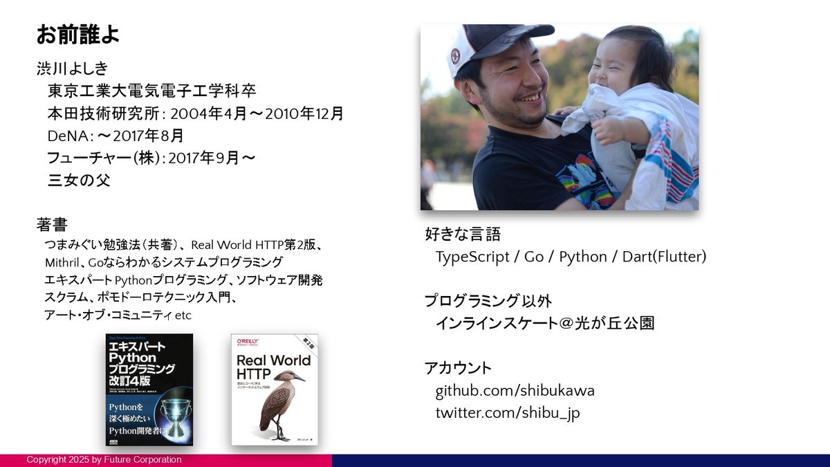 まず「お前、誰よ?」ということですけれども、フューチャーは3社目ですね。1社目が自動車の本田技術研究所で、2社目がDeNA。3社目がフューチャーで、入ってもう8年、9年目ぐらいですかね。好きな言語はTypeScriptとかGoとかPythonですね。Pythonは大学3年からなので、もう20年ぐらい使っていますかね。