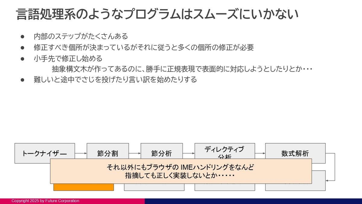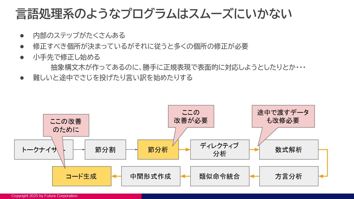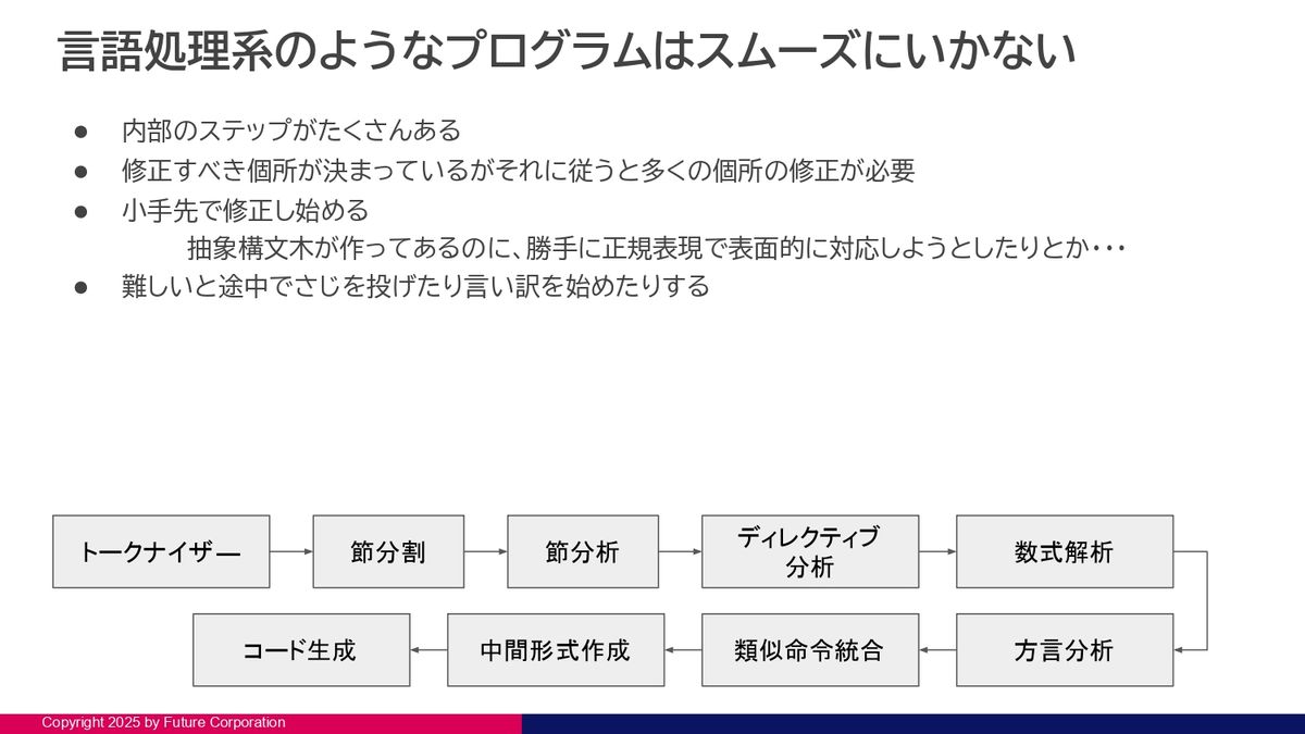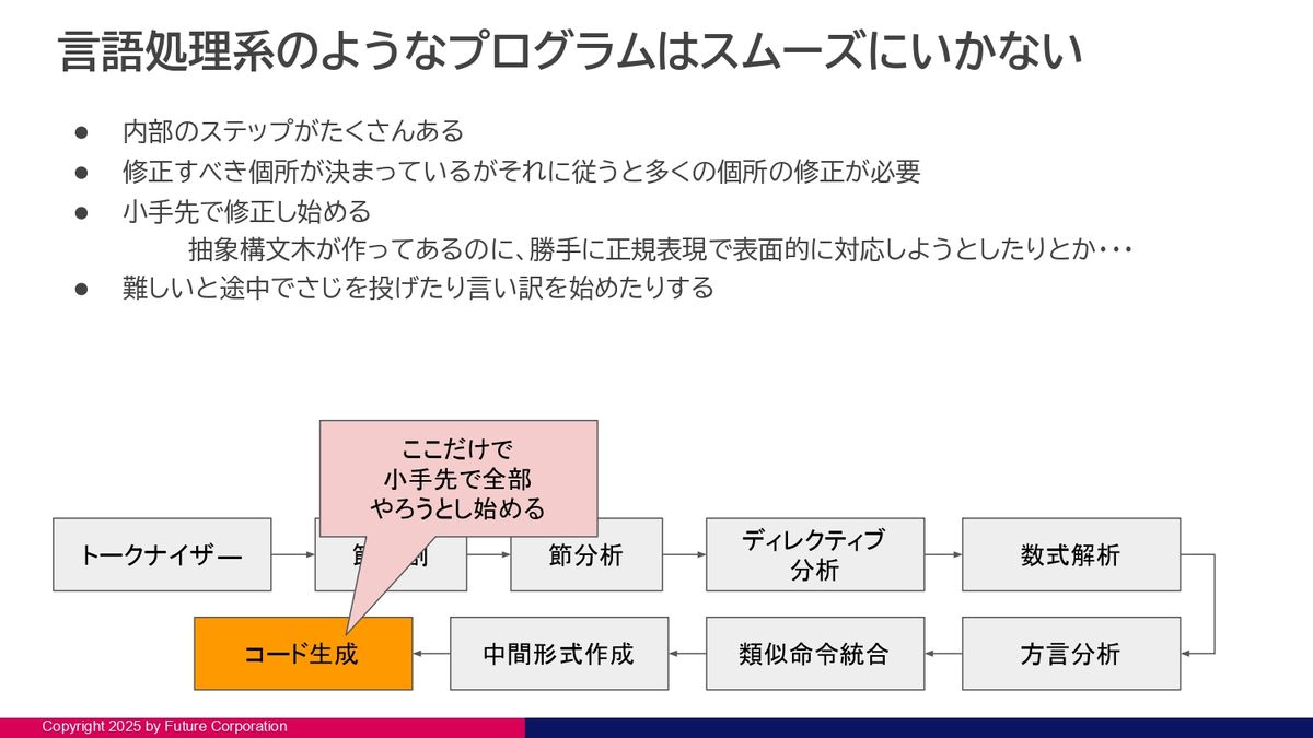 渋川:実際にコンパイラとかを作られたことがある方はどのぐらいいるのかはわからないですけれども、そういう複雑な、内部ステップ数が多いようなやつを開発しようとすると、まだうまくいきません。たくさん指示を出してあげたりしなきゃいけないなというところですね。