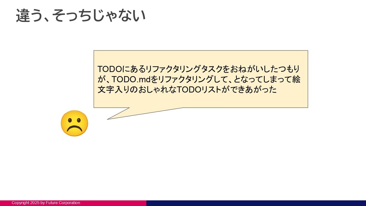 ToDoに「リファクタリング」って書いて、リファクタリングしてよって言ったら、ソースコードのリファクタリングじゃなくて、ToDoリストのリファクタリングを始めて、絵文字がいっぱい入ったキラキラしたToDoリストになったということはありましたね。