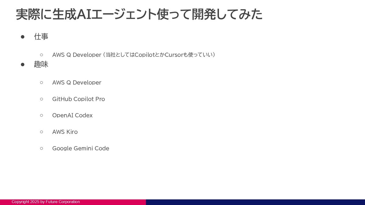 いろいろ言われているけど本当かどうか、実際に使ってみないとわからないなということで、使ってみました。仕事でも「Q-Developer」を使ったり、会社としては「Copilot」とか「Cursor」も使っていいことになっていますけども、個人でもいろんなエージェントを契約したりとかして、いろいろ使っていました。
