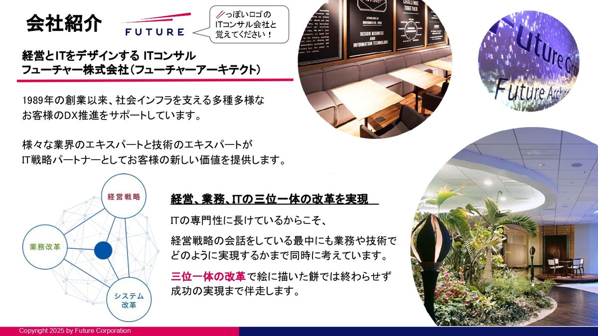 宮嵜拓海氏(以下、宮嵜):本日、渋川さんのサポートで入っています、宮嵜拓海と申します。今年で3年目に入るITコンサルタントです。経歴としましては、2023年に千葉大学の大学院の情報科学系のコースを卒業しまして、2023年の7月にフューチャーに新卒で入社いたしました。