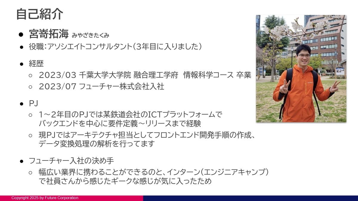 その時に、社員さんがすごく技術が好きな、「ザ・ギーク」って感じの人が多くて。自分もエンジニア寄りの技術好きなタイプの人間なので、「すごくいい雰囲気の会社だな」というところでフューチャーに入社いたしました。本日はよろしくお願いします。