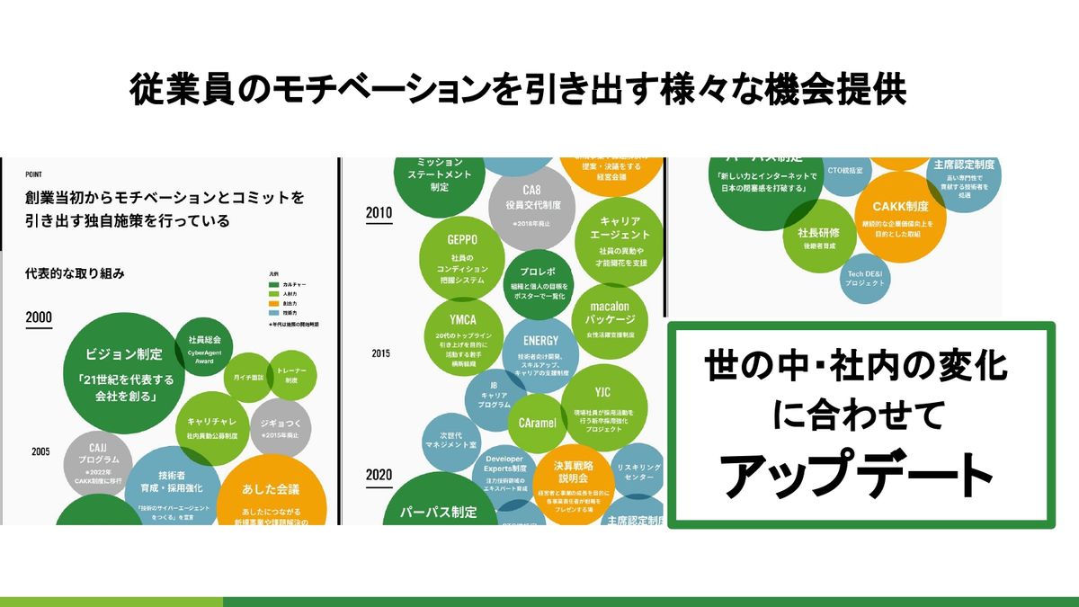そんなサイバーエージェントは、従業員のモチベーションを引き出すさまざまな機会を提供しております。設立が1998年になっていますが、そこからいろいろなものに取り組んでいます。一つずつ説明することはできませんが、例えばキャリチャレは社内異動の制度だったりですね。