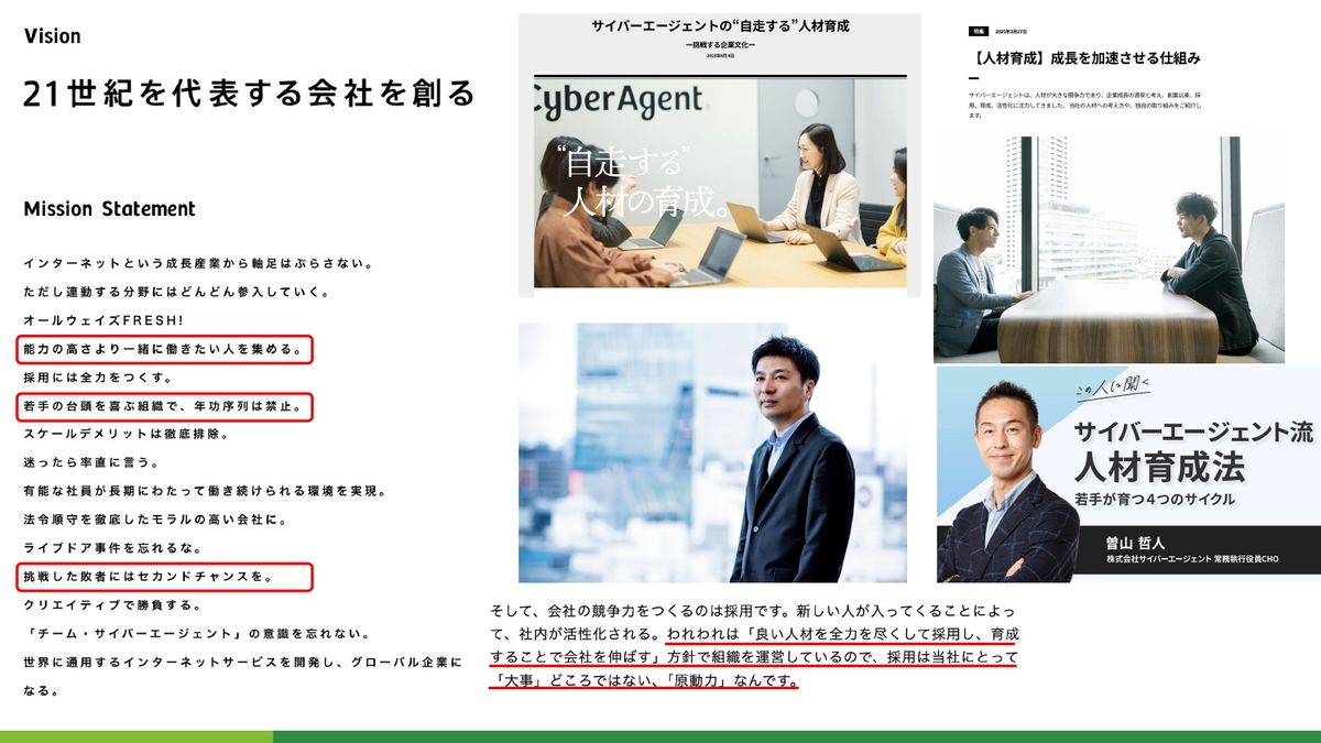 右下はサイバーエージェントの人材育成方法などですね。左下は藤田晋のインタビューから持ってきましたが、「われわれは『いい人材を全力を尽くして採用し、育成することで会社を伸ばす』方針で組織を運営しているので、採用は当社にとって『大事』どころではない、『原動力』なんです」といったものがいろいろあります。