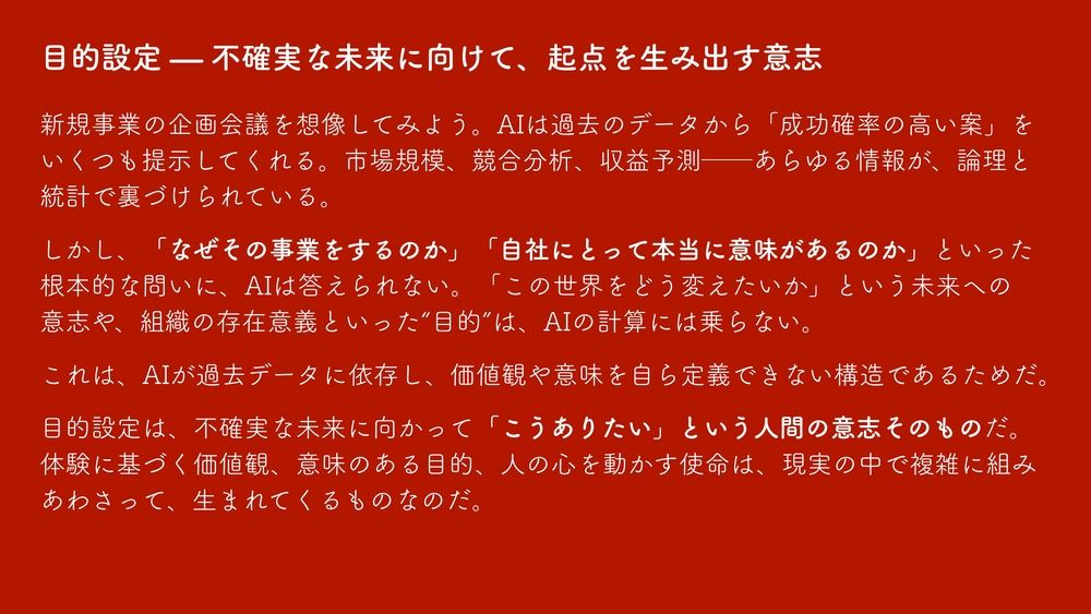 不確実な未来に向けて、起点を生み出す意志です。AIは成功確率の高い案統計で裏付けることはすごく得意なんだけども、「なんでその事業をするの?」とか、「自分にとって本当に意味があることって何?」とか、このような問いに対してAIは答えられない。