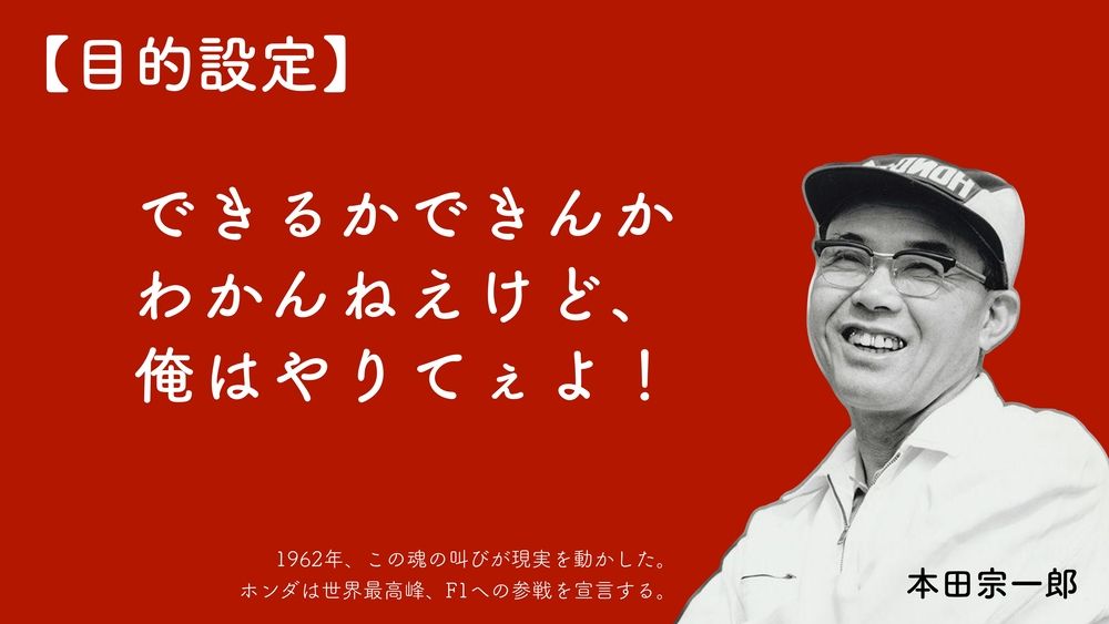 まず1個目が目的設定です。目的設定というと、僕は(ホンダの創業者である)本田宗一郎がめちゃ好きで尊敬しているんですが、彼がF1にチャレンジした時にこんなことを言ったんですよね。「できるかできんかはわかんねえけど、俺はやりてぇよ!」と。