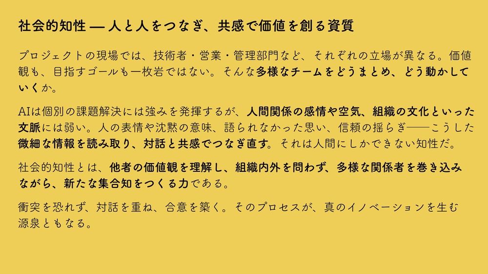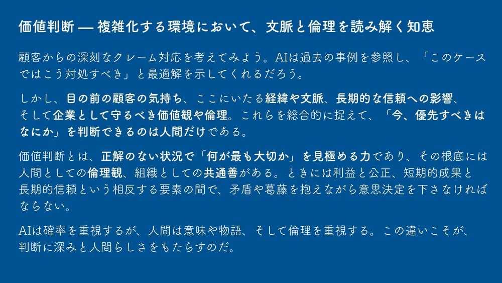 環境が非常に複雑化している。そこから文脈と倫理を読み解く知恵。例えばAIは過去の事例から最適なクレーム対応みたいなのは、ある程度考えることができる。でも、目の前のお客さんの気持ちとか、そこに至るいろんな経緯がありますよね。さらに長期的な信頼に対する影響とか、企業が持っている価値観とか、その時の社会が持っている倫理感とか。