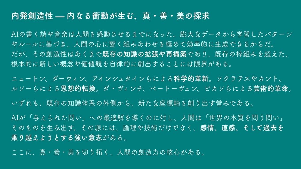 人間にはそれを超えたものがあります。感情とか直感とか、過去を乗り越えようとする強い意志。人間の根源にある「真・善・美」への探究心と、それを切り拓くための人間の想像力の核心になっていると思います。これは目的設定と色濃く関係しています。