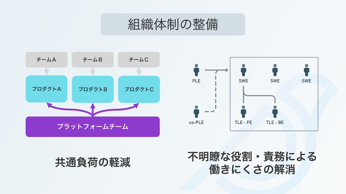 そして戦だけではなく、未来への身支度も行ってきました。組織体制の整備と、生産力の維持・増強です。複数チーム・プロダクトを下支えするため、プラットフォームチームを新設。そして、チームメンバーの役割と責務を整理して、チーム拡大と評価の礎としました。