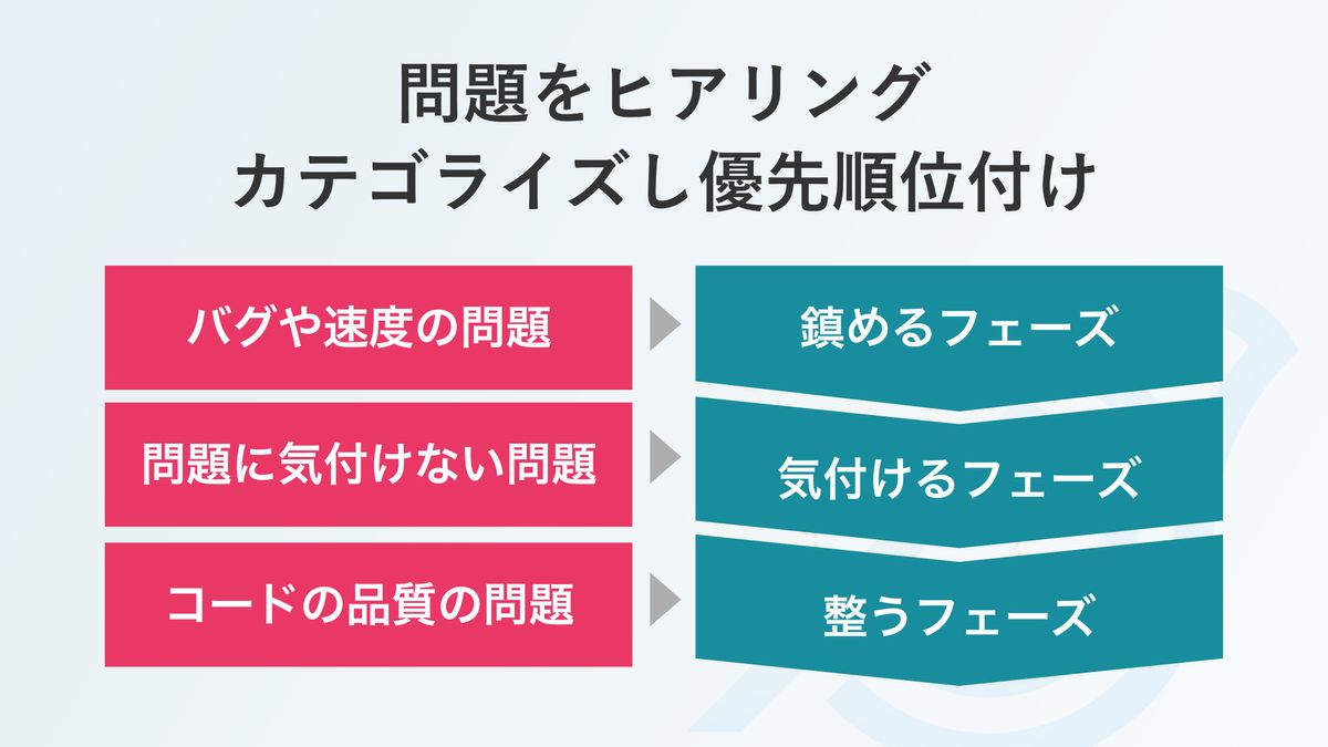 そして、繁忙期に新たなバグを仕込むことは何としても避けたかったので、プルリクは私自身もすべてレビューする方針で進めました。そして、問題をヒアリング、カテゴライズして優先順位付け。「鎮めるフェーズ」「気付けるフェーズ」「整うフェーズ」として進めました。