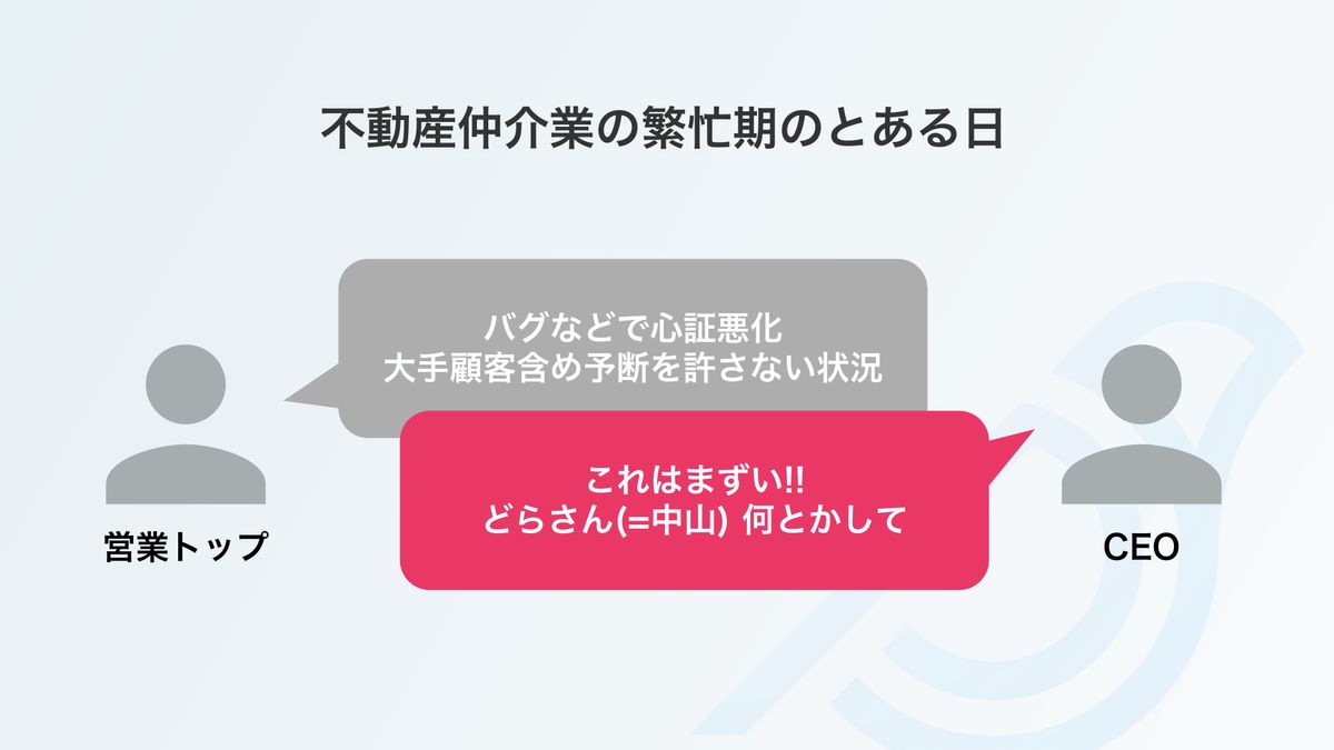 繁忙期のとある日、急遽ミーティングがセットされました。ドキドキ。「バグやパフォーマンスの問題で、心証が非常に悪化しています。大手顧客を含めて予断を許さない状況です」「これはまずい。どらさん(中山)、何とかして」。
