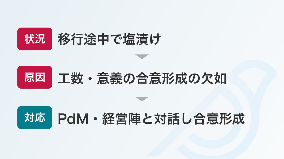 「こんな状態では、いいものづくりはできないよ。これはもう終わらそうぜ」と心に決めました。移行途中で塩漬けになってしまっていたのは、合意形成ができていなかったためです。そこで、あらためてPdMや経営陣と対話して、合意形成を行ってプロジェクトを立ち上げました。