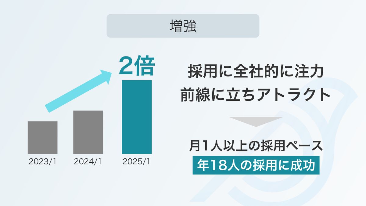 増強に関しては、採用に全社的に注力。私自身も前線に立って、面談・面接を行ってアトラクト。結果的に、年18人のすばらしいメンバーにジョインしていただきました。