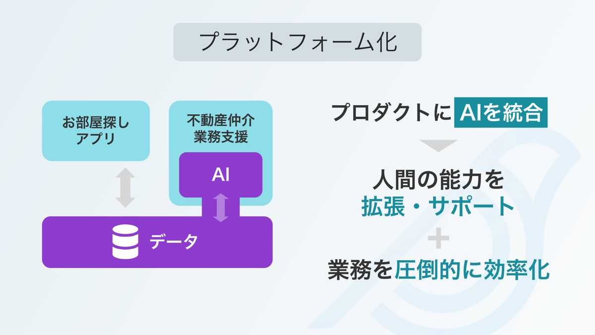 これからカナリーは、データを軸にしたプラットフォームへと進化していきます。詳細・即時にデータを連携し、理想の生活に合ったお部屋探しと、おとり物件の削減を実現します。そして、そのデータと処理をAIへとつなげていきます。人間の能力を拡張・サポートして、業務を圧倒的に効率化します。