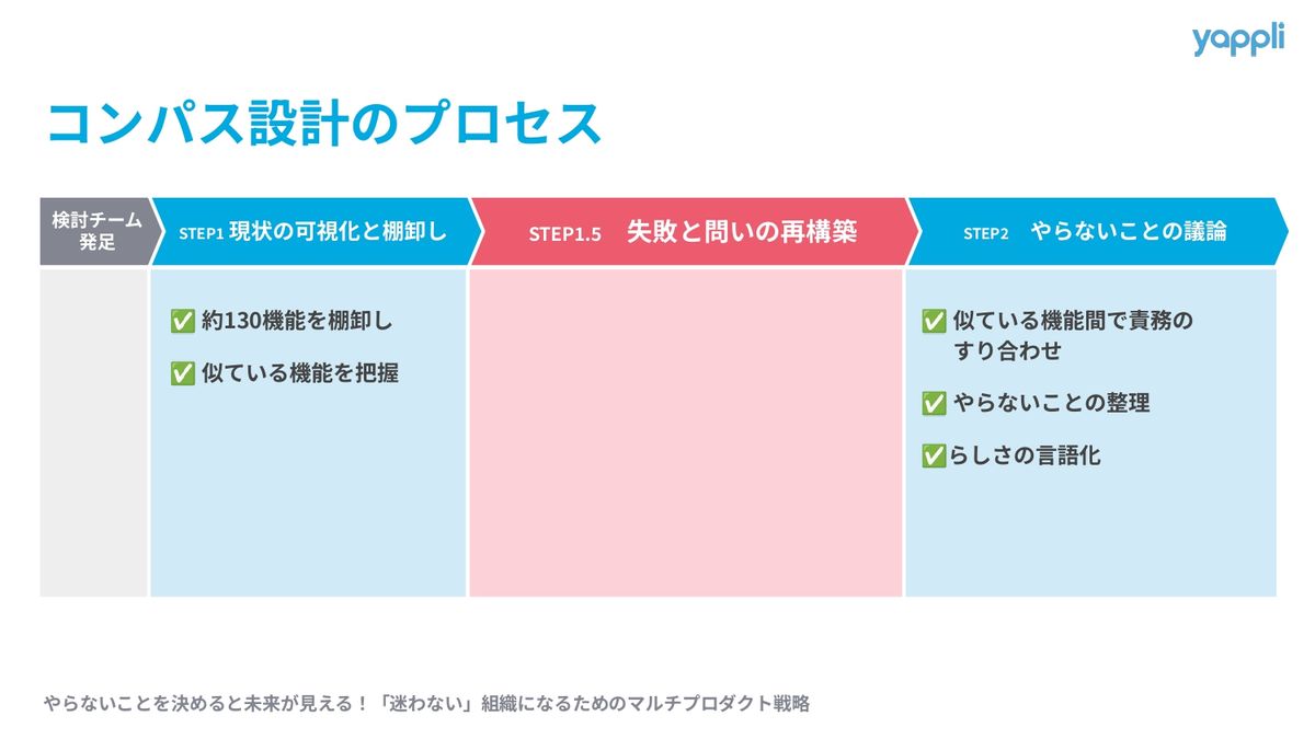 進め方の最大のポイントは、当初のやることを決めるというアプローチから、やらないことを通じて、プロダクトのらしさを言語化するというアプローチに方向を転換した点になります。