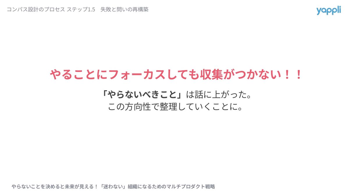 このままだとYappliとYappli CRMにおける差異が明確にできないとなり、やることにフォーカスしても収拾がつかないという結論に至りまして。思い切って議論の方向性を転換していくことをいたしました。