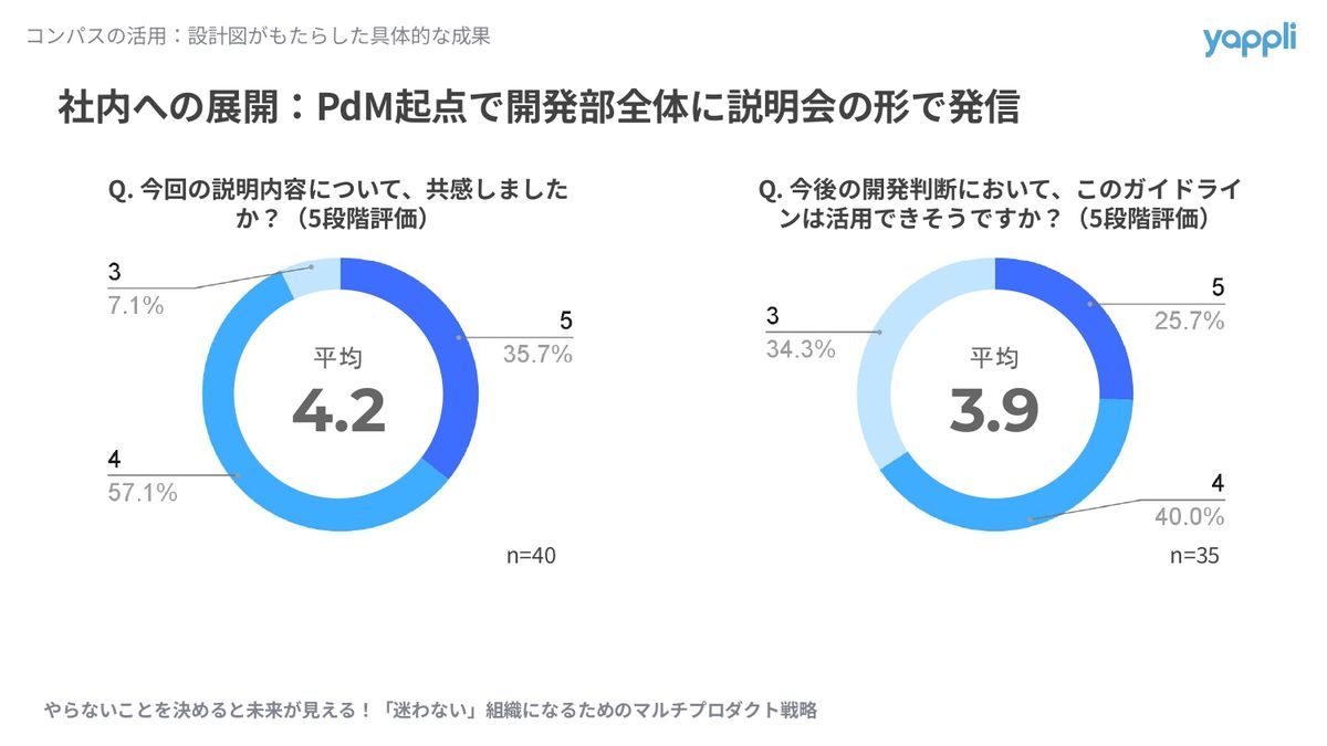 その結果のアンケートですが、5段階の平均で「共感しますか」が4.2ポイント、「活用」が3.9っていうような評価になっていました。前者のほうが高めに出ているんですが、プロダクト間の役割分担を明確にすることの重要性についてはかなり共感の声が多く、「住み分けが明確になって良かった」とか、「役割が明確のほうが効率が良くていいね」っていうような声を聞くことができました。