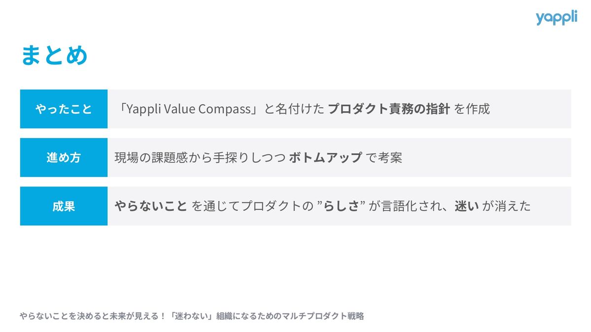 本日のまとめになります。私たちはマルチプロダクト戦略において、開発の迷いを減らすため、Yappli Value Compassというプロダクト責務の指針を作成いたしました。