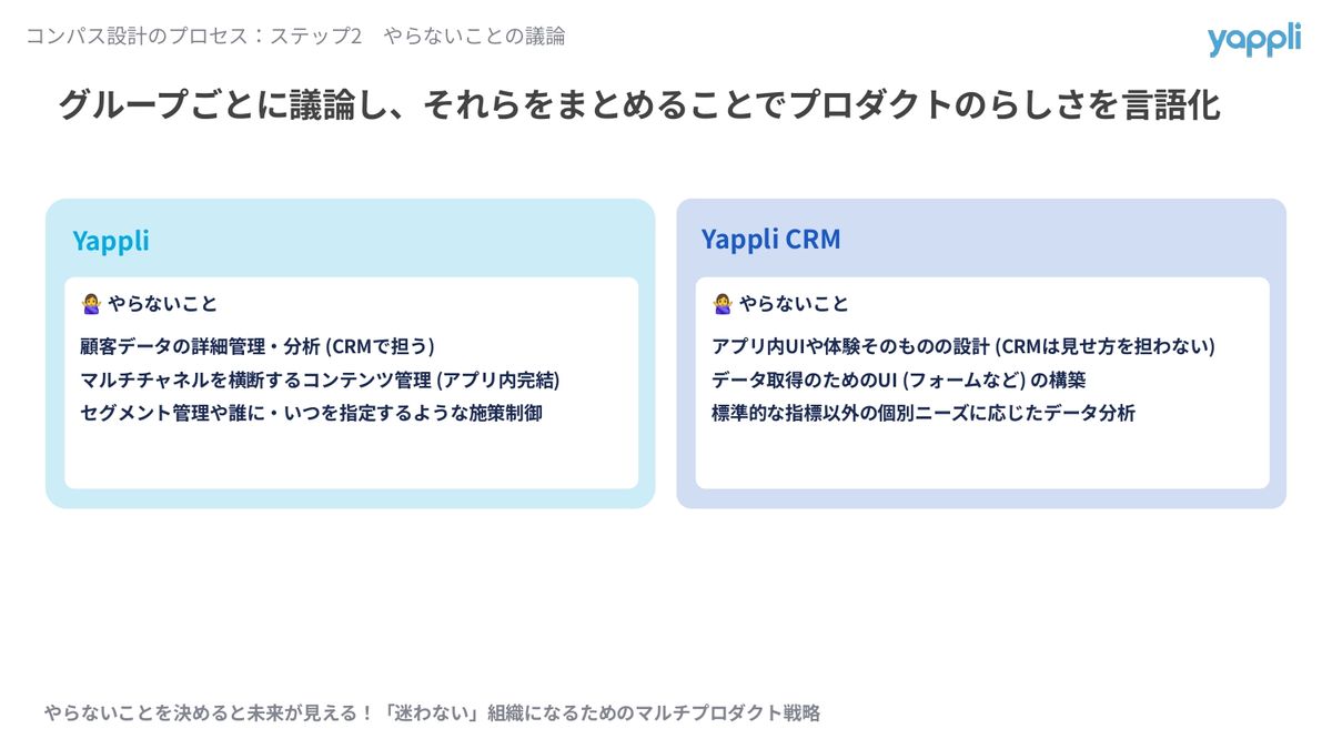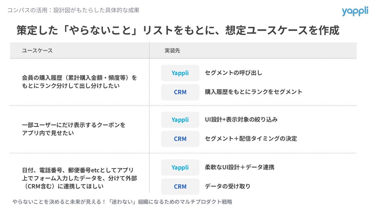 このようにやらないことの切り口でそれぞれの機能を言語化していき、それらをまとめてプロダクトのらしさを言語化することができました。結果、Yappliはアプリ内の体験にフォーカスして、顧客データの管理とか分析・セグメント管理みたいなところはYappli CRMにやってもらう。一方でYappli CRMのほうは、施策の実行や分析にフォーカスするので、アプリ内UIとか体験そのものの設計はYappliにやってもらおうと決めることができました。