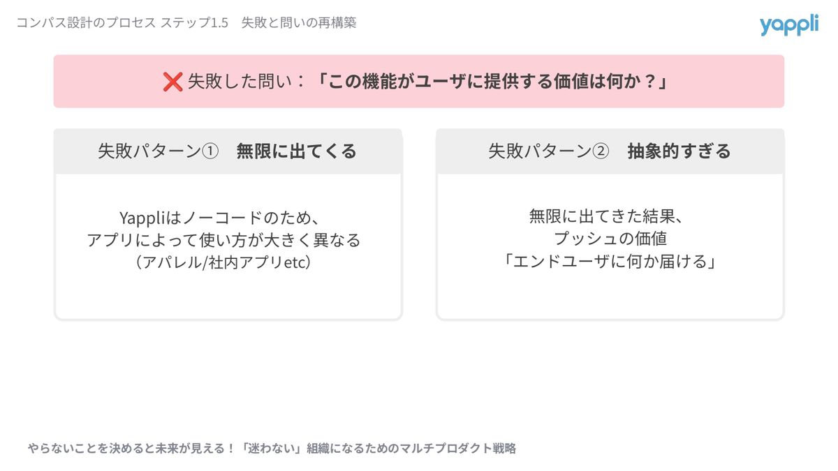 というのも、まず価値を言語化しようとしても、正直無限に出てきてしまうということがありました。Yappliはノーコード製品なので、冒頭に説明したように、アプリの使い方とか目的が、本当にクライアントによって大きく異なるんですね。なので、1つの価値の機能が多岐にわたりすぎて、収拾がつかなかったっていうところがございます。