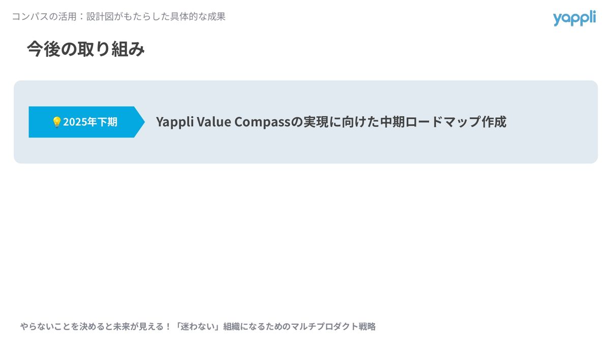 今後はこの「Value Compass」をさらに洗練させて、中長期ロードマップに落とし込んでいきたいなと思っております。2025年にやったことをホットに話しているので、まだ着手中なところもあるんですが、これからも方針の見直しなどを含め、継続的に議論していきたいなと考えております。
