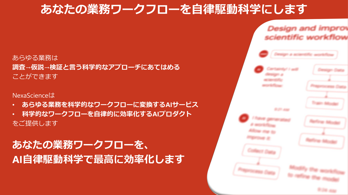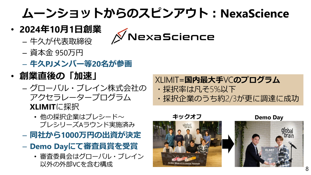 実際にムーンショットの中でも、「ぜひ、社会実装してください」と内閣府およびJSTからいろいろな熱い応援をいただいて、背中を押されて、NexaScienceという謎の企業を作りました。