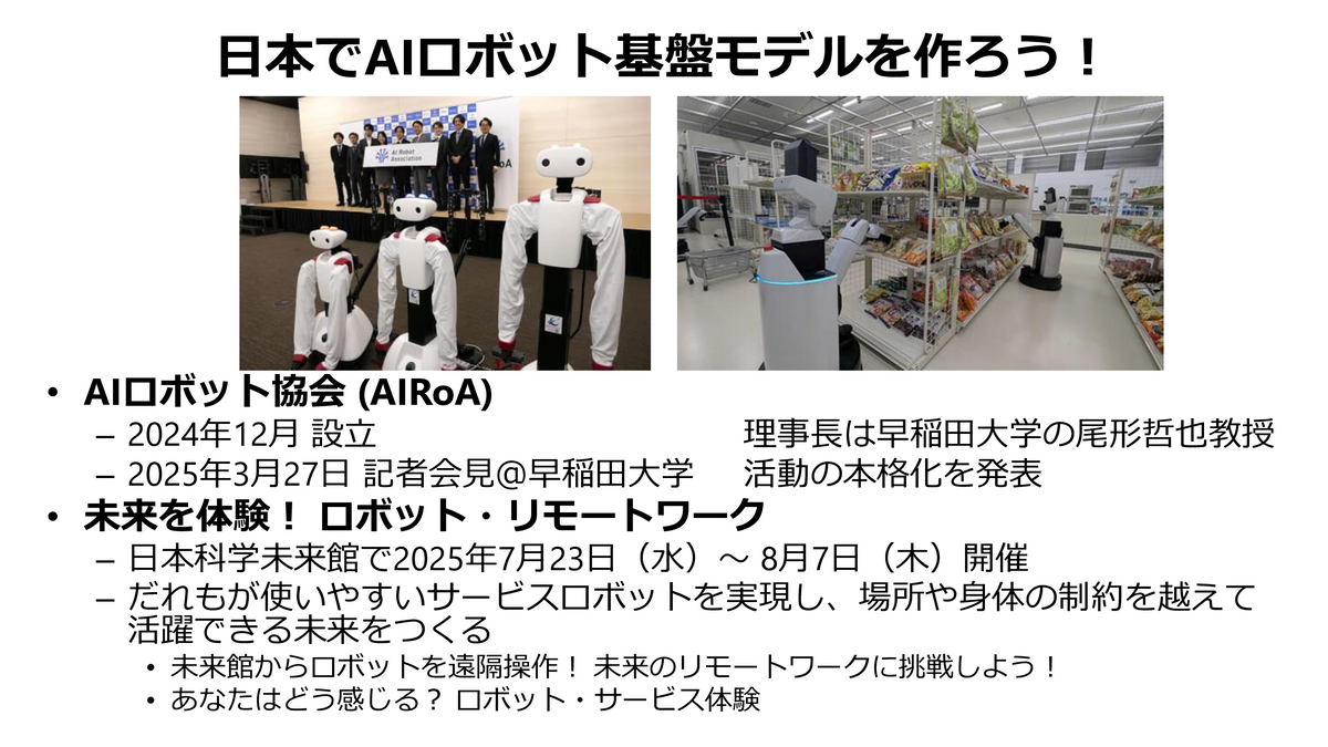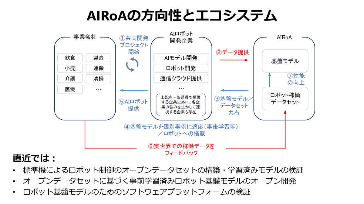 どういうことをできる協会なのかというと、AIRoA(AIロボット協会)としては、(スライドを示して)ここになりますと。それぞれ事業会社として「いろんなところで事業をするぞ」と、飲食や製造とか、先ほどの小売店での品出しみたいなところにAIロボット事業として何かロボットを提供されたいと考えていらっしゃるわけですね。この人たちが使うためのAIモデルを作りますよと。