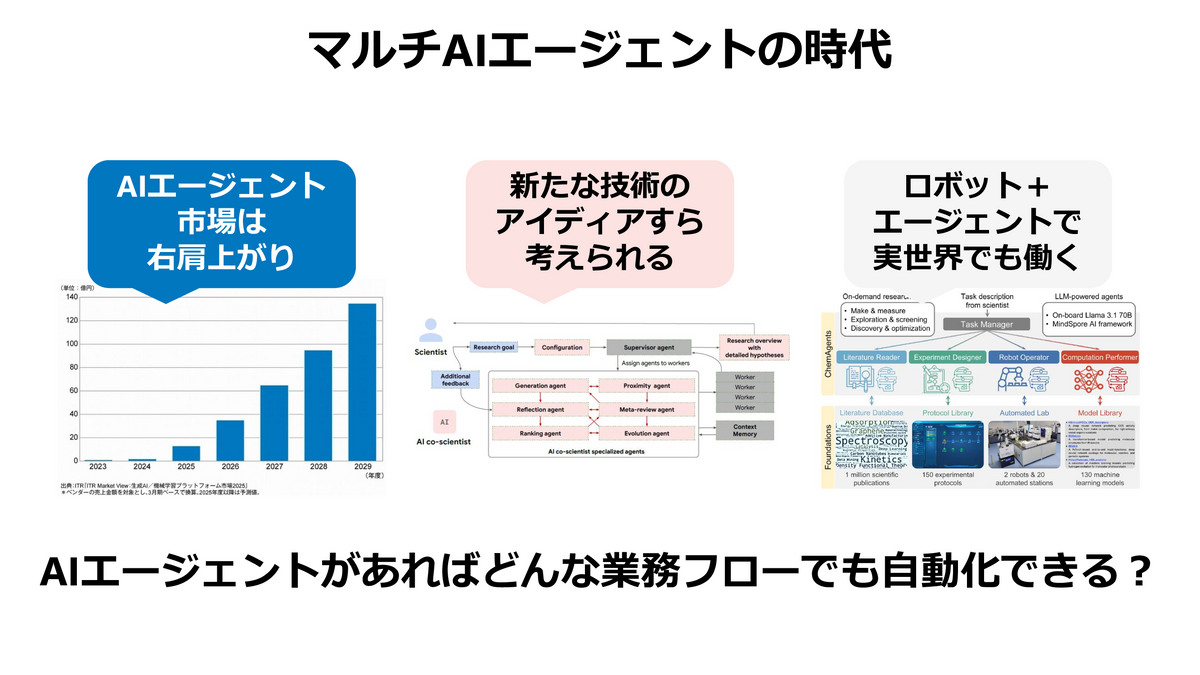 「じゃあ、今は何を考えているか?」という話です。兎にも角にもAIエージェントがいろんなところで活躍をしている時代です。もう何でもAIエージェントでお仕事を手伝ってくれそうな雰囲気があります。
