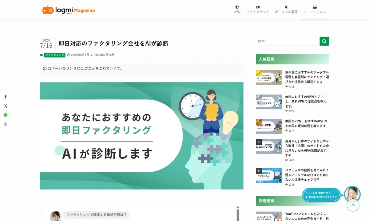 現在、VPN、ファクタリング、ポータブル電源、キャッシュレス決済サービスの4ジャンルを対象に、実用的な比較情報を提供中です。