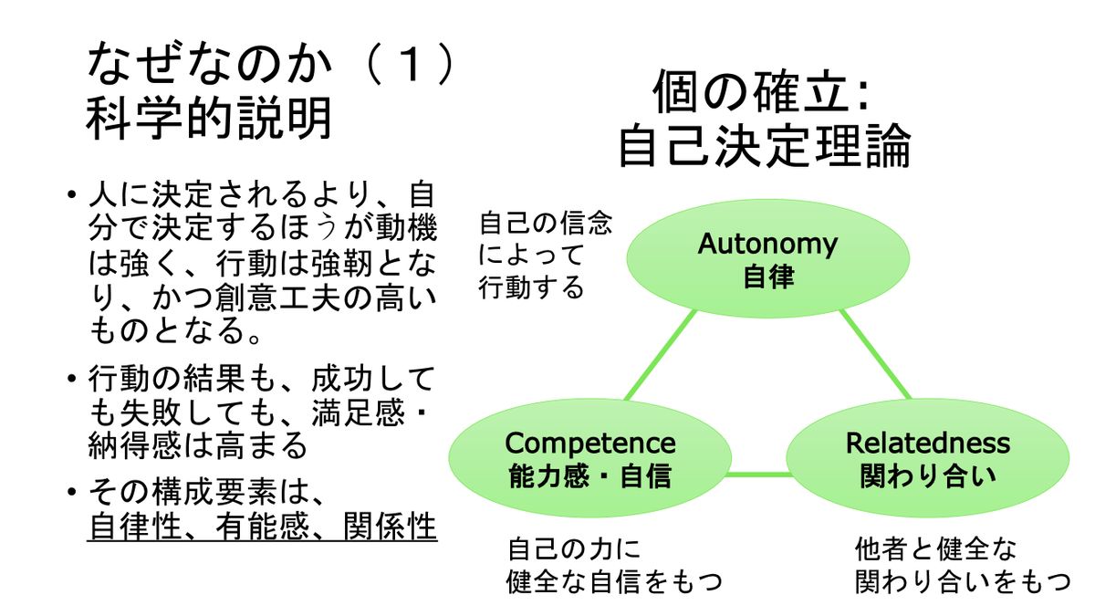 要素をさらに言えば3つです。第一に、自ら意思決定していること(信念に沿って行動できる)。第二に、自己肯定感(健全な自信)。第三に、仲間への信頼や良好な人間関係。これらがそろうと自己決定が成立します。