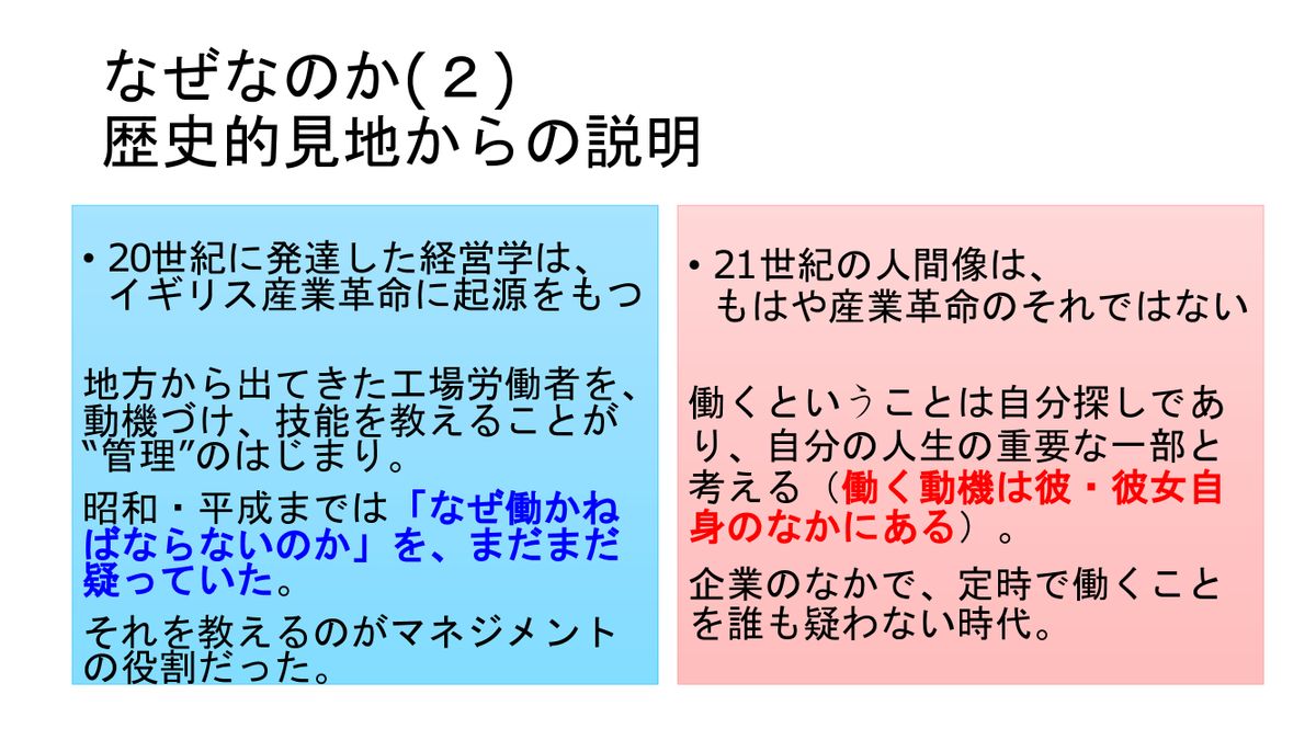 20世紀初頭であれば、「都会へ行け」「ここで9時から17時まで働け、給料は出る」という世界でした。「なぜ働くのか」は家族主義的経営のもとで上から与えられました。21世紀になると、「何のために働くか」を自分で合点しなければならない状況になりました。社会が発展し、食うためだけに働く時代を過ぎたからです。
