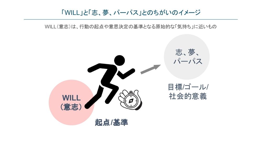大川:ちょっと資料を共有してもいいですか? 僕がいつもこの話をする時に、必ず最初に整理をすることがあります。WILLに対してプレッシャーを感じている人は、夢とか、志とか、パーパスを作れと言われているように捉えるからなんです。