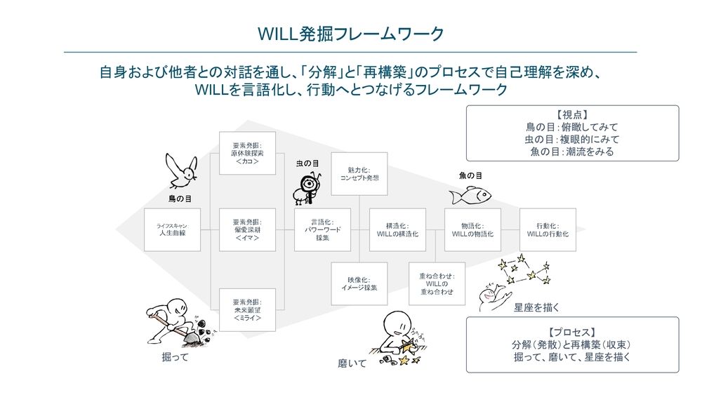 WILLを言語化していくアプローチは、本質的にはさっきの「WILL-ACTION Cycle」なんですけど。僕が書籍などで書いたように、フレームワークを使って自分でやるのが、最短で再現性があると思っています。