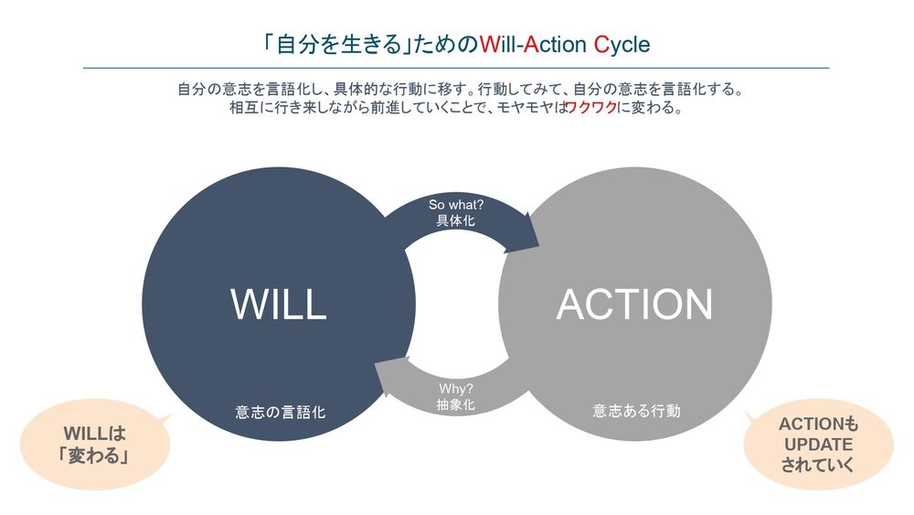 大川:アプローチは二通りですよね。WILL-ACTIONのサイクルを回すことが良い状態だと思っているので、WILLからいくか、Actionからいくかということです。WILLからいく時には、さっきの問いではなくて、分解します。結局、「どういう生き方をしてきたんだ?」「どういう経験・原体験があるんだ?」「何が好きなんだ? なんで好きなんだ?」「何をしたいの?」「週末にやりたいことは何?」とか。