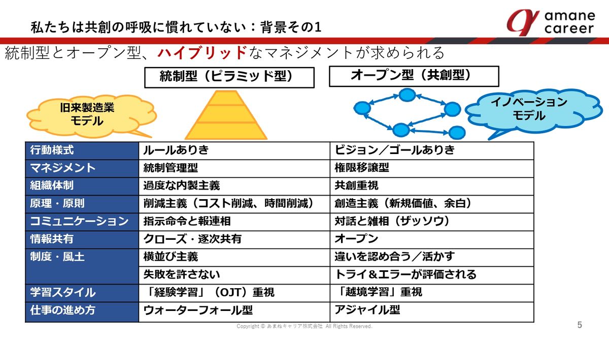 過去に答えがないもの、組織の中に答えがないものに対して、つながり合って答えを出していく越境型、共創型の呼吸が求められています。とは言え、組織は急には変わらないし、私たちも急には変わらないので、徐々に右の共創型のチームプレーに慣れていかないといけない。場合によってはトレーニングを施していかないと、組織としても停滞してしまうリスクが高いと言えると思います。