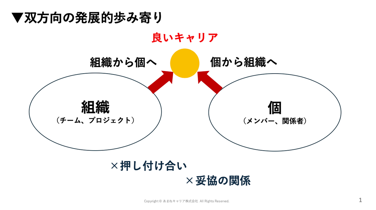 これは組織と個がそれぞれお互いの事情だとか、あるいは「この仕事を通じて、あなたにどうなってほしいか?」「この仕事を通じて、あなたにどんなキャリアの可能性とか、成長の可能性があるか?」を示しながら対話する。