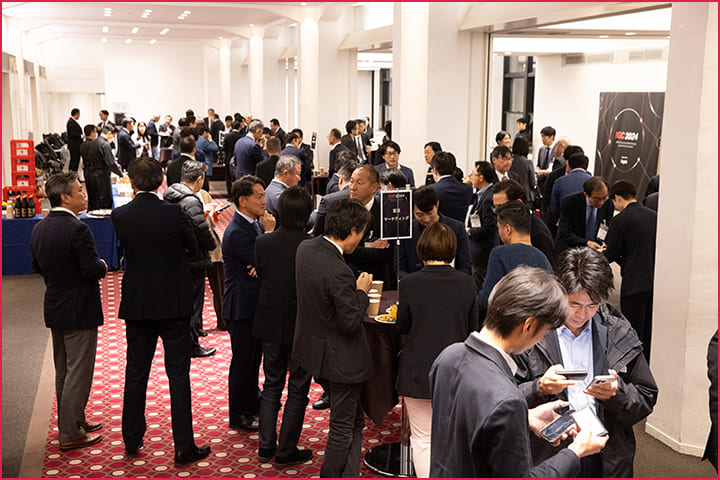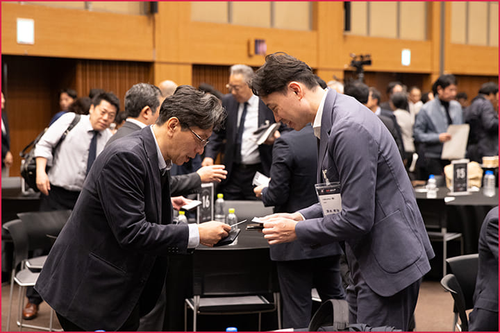 - 講演を聞くだけでなく、各テーブルでの名刺交換・ディスカッション、全体交流会など