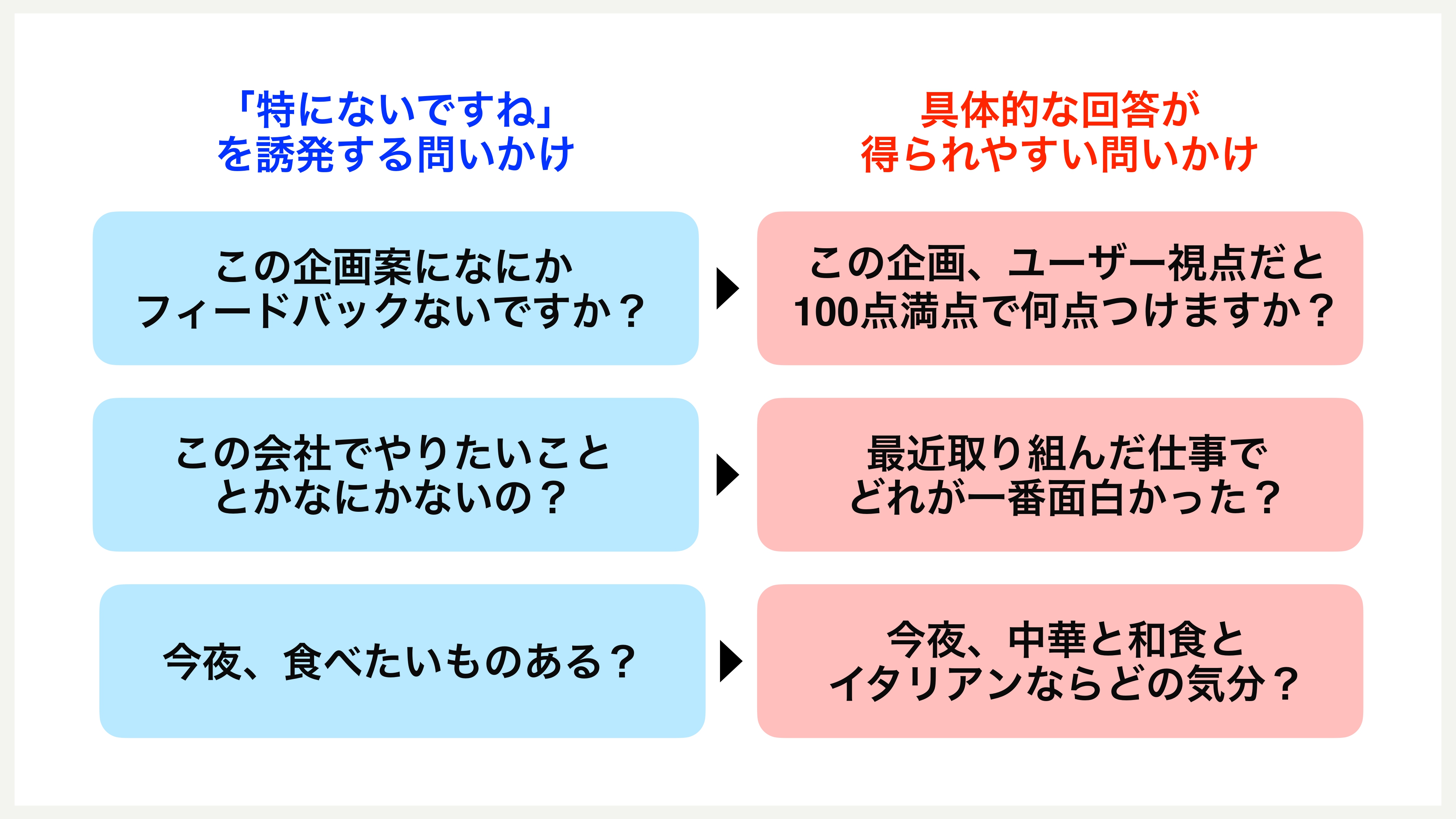 「特にないです」という回答を防ぐために 「改善案をお願い」よりも「ユーザー目線で何点?」と聞く