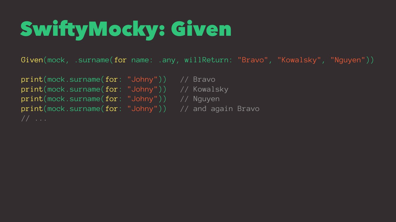 先ほどのSwiftyMockyとわりと雰囲気が近いかなと思います。「any〇〇」というのも先ほどのanyと同じような感じですね。こちらもstubのチェインができて、それで複数回呼んだり、あと一番下のやつは可変長引数の形ですが、これを呼ぶことでSwiftyMockyと同様に複数回呼んだときに順々に返していくことができるようになっています。
